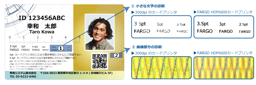 ① ② は、Adobe Illustrator を使用して作成した同じデータを、HDP6600 カードプリンターと 300dpi のカードプリンターから実際に発行し、それぞれ比較したものです。